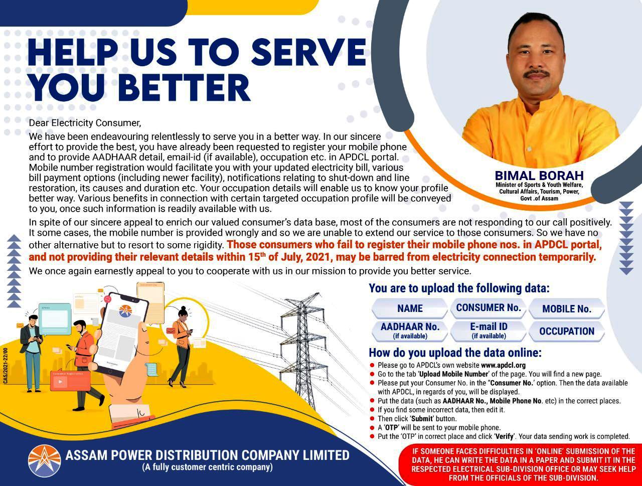 APDCL ने कहा है की , 15 जुलाई, 2021 के भीतर अपना प्रासंगिक विवरण प्रदान नहीं करने पर, बिजली कनेक्शन अस्थायी रूप से रोक दिया जा सकता है।